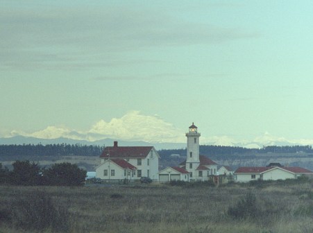 Local postcard scene: evening looking northeast at Baker from Fort Worden. Western end of Admiralty Straights, and southern Whidbey Island are in near background.