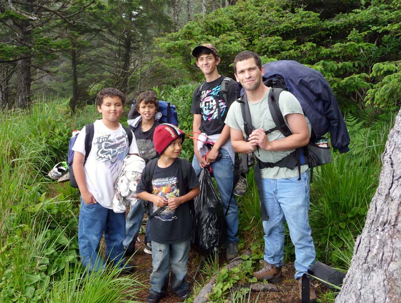 Steve and the boys - Orion, Sjon, Sebastian and Chris - at the edge of the cliff, after we emerged from the coastal jungle Back to Main Page