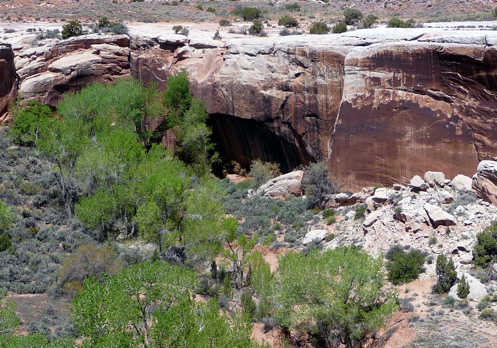 Suddenly we arrived at the edge of Salt Wash, with green with trees and shrubs between its vertical rock walls