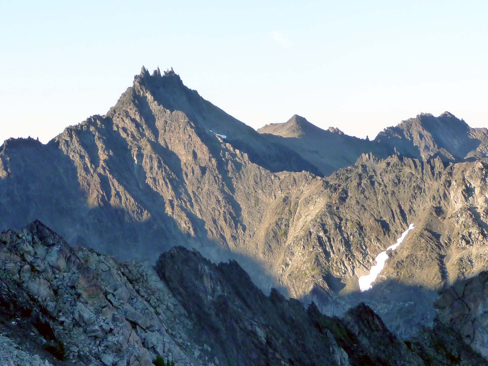 Barren, rocky peaks rose above the valley, hiding Carrie Glacier which was on the other side of the ridge.