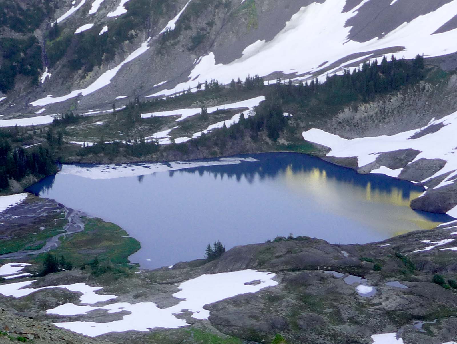The sun has already set at Stephen lake, but reflections of the sunlit slopes above are still visible.