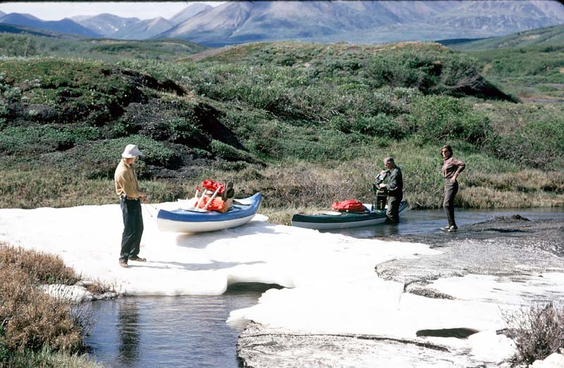 Overflow ice from last winter still blocked our way in places - Mark is dragging his boat across Back to Main Page