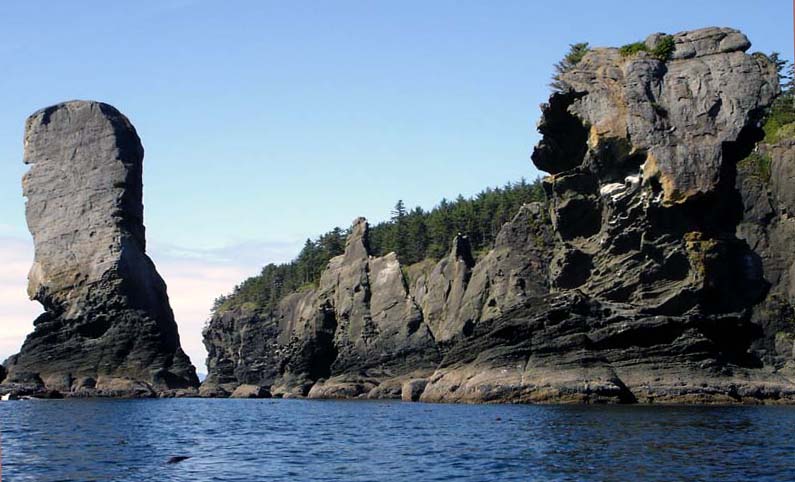 There are amazing rock formations along the shore, among them this unclimbable rock island known as the Fuca Tower.