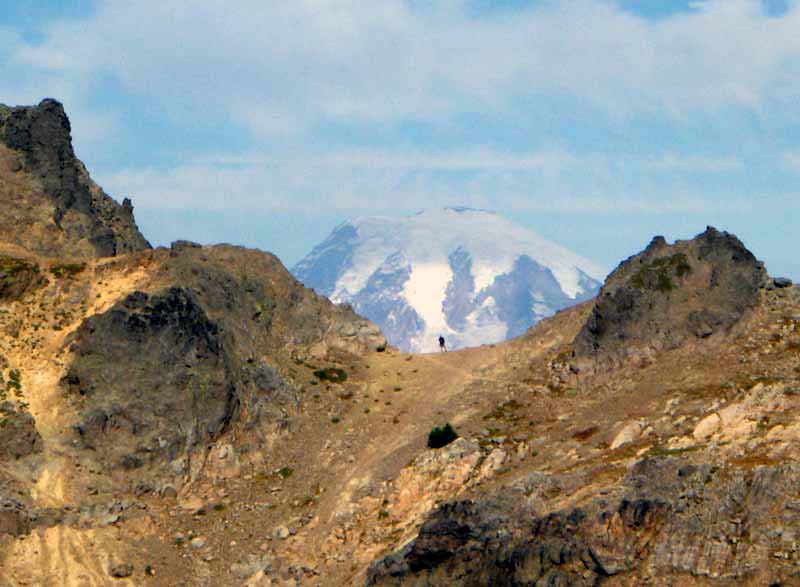 Steve is silhouetted against the glacier on Mt. Rainier as he walks on the ridge towards Hawkeye Point Back to Main Page