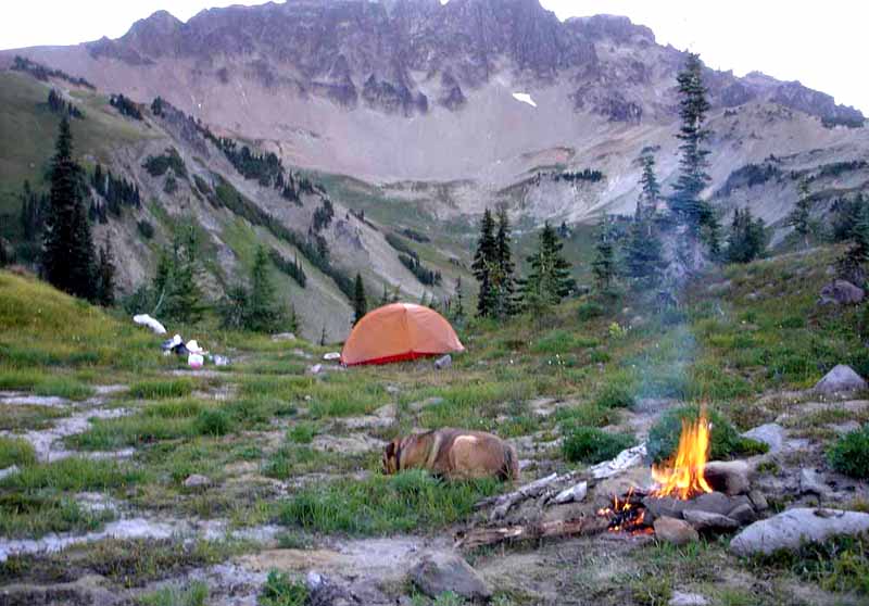 After a last minute change in campsites to a wooded area, we are up at dawn to warm up by a fire Back to Main Page