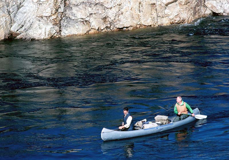 On the cold but crystal clear river Jim and Duke are paddling their heavily loaded Grumman Back to Main Page