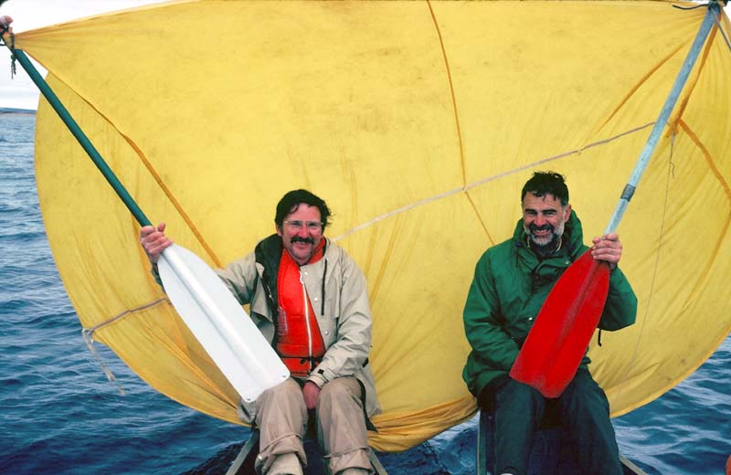 Next day we took advantage of the wind by lashing the canoes together and sailing down the lake with great speed Back to Main Page