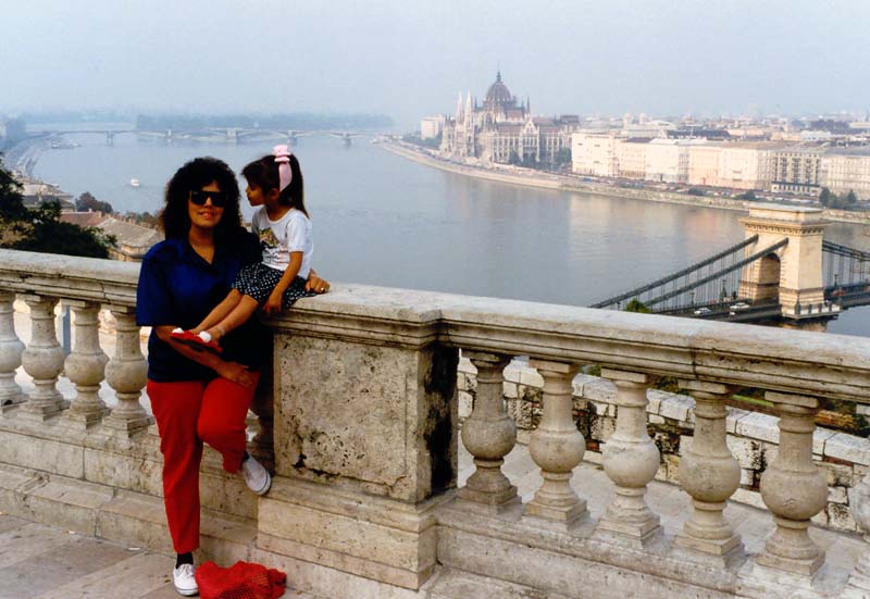 Bobbi and Jessica enjoying the view from the Castle-garden: Margit Sziget (Island) and the Parliamant Building Back to Main Page