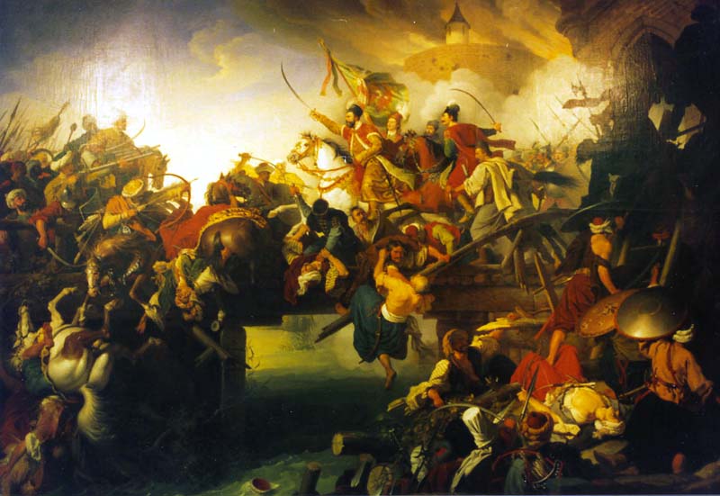 This painting by Johann Krafft shows the famous battle fought in 1566 by Count Miklós Zrínyi against an overwhelming force of Turks in defense of the castle of Szigetvár. Back to Main Page