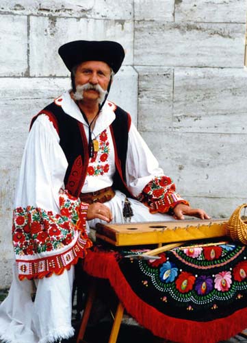 A street musician clad in Hungarian attire