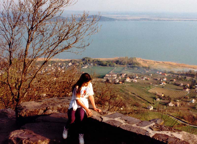Jessica at one of the lookouts on Badacsony hill; beyond her the double hills of Fonyód across Lake Balaton Back to Main Page