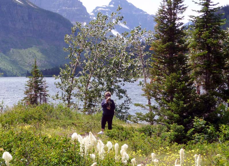 Bobbi and Lola taking a walk among the flowers on the lakeshore trail by our campsite. Back to Main Page