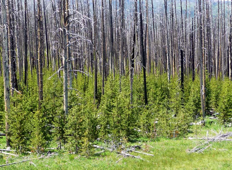 Further south we entered an area devastated by the great fire of 1988. The forest was recovering nicely, but the old burned out stumps will be around for a long time. Back to Main Page