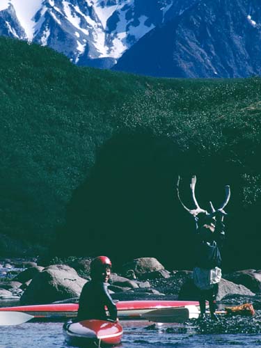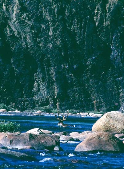 Caribou swimming across the river in front of us
