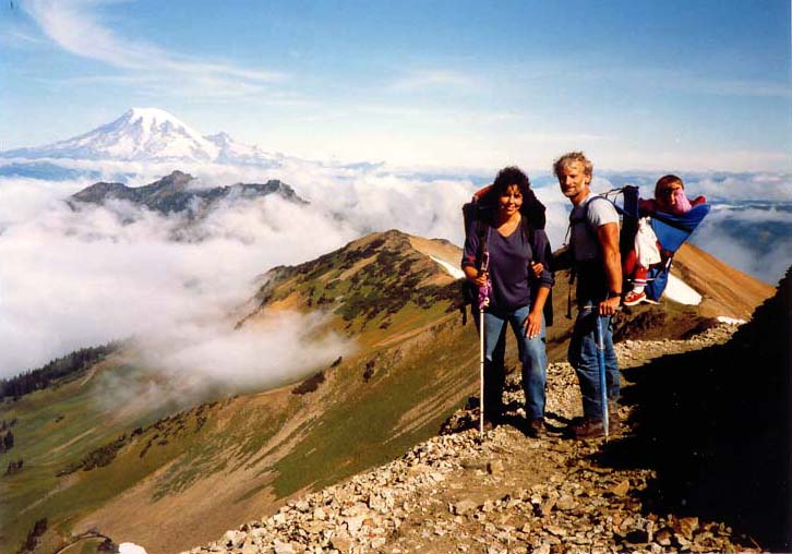 On a Labor Day weekend we followed the Pacific Crest Trail to camp in the Goat Rocks. We woke to a cloudy sky, but as we gained elevation, we got on top of the clouds and had this fabulous view north to Mt. Rainier. Back to Main Page
