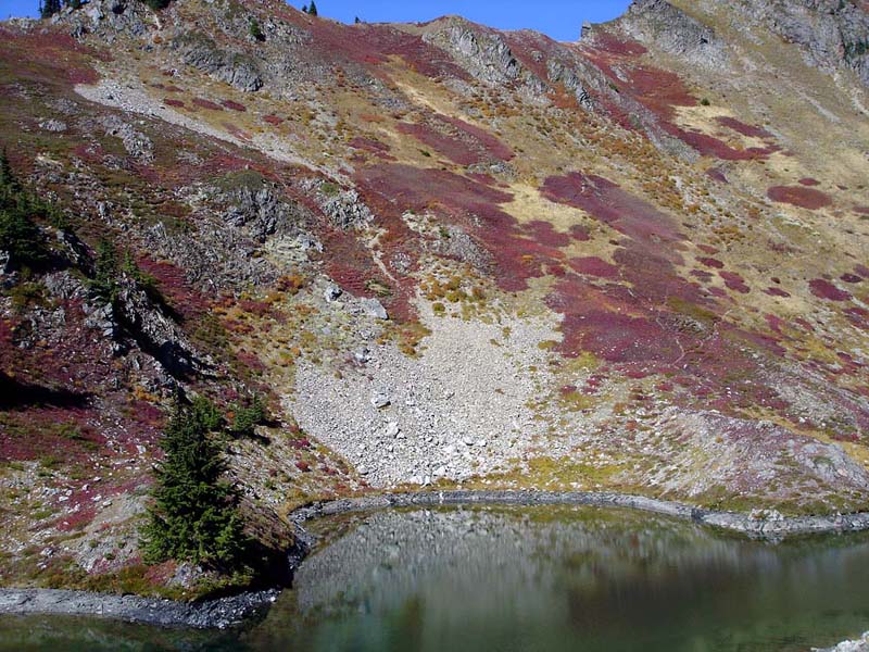 This beautiful lake, between the High Divide and Appleton Pass, has been named unofficially: Swimming Bear Lake Back to Main Page