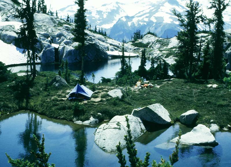 We found this ideal campsite, surrounded by little lakes and snowfields