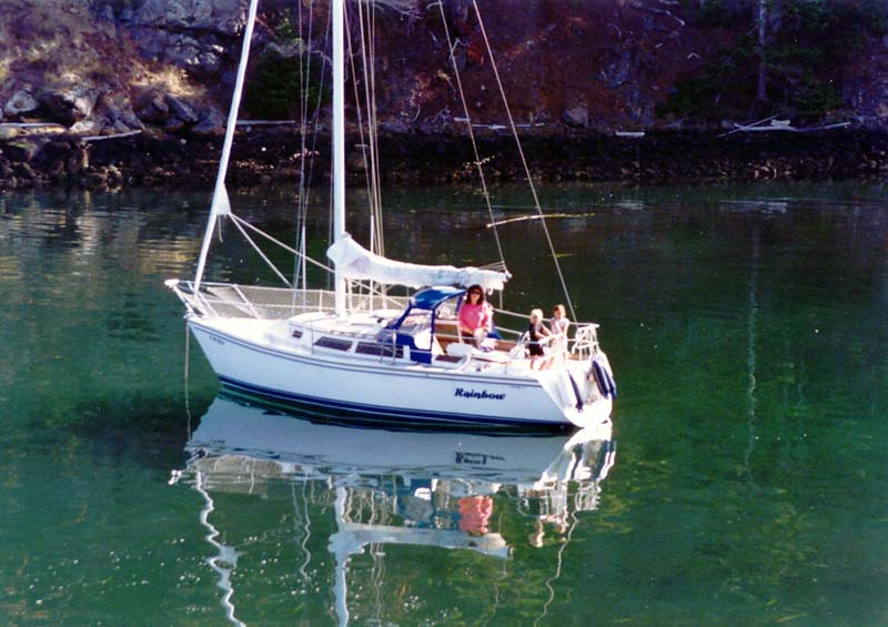 Our new sailboat Rainbow anchored in our favorite little cove at the south end of Decatur Island Back to Main Page