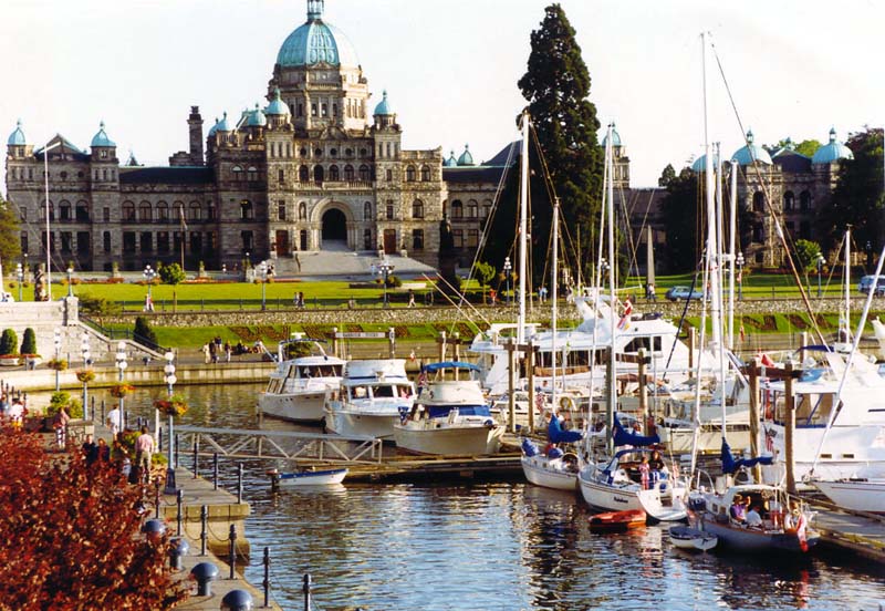 Rainbow is tied up to the dock in front of the BC Parliament Building and the Empress Hotel. Back to Main Page