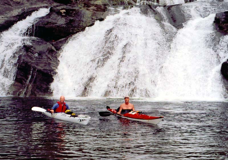 This waterfall was connected to the sea by a narrow channel and we were able to surf in to the pool below it. We enjoyed bathing in freshwater and washing the salt off our kayaks and spraycovers. Back to Main Page